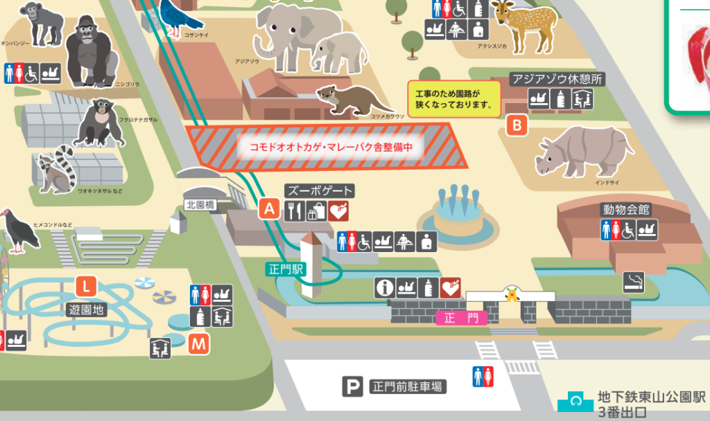 地下鉄で行く場合は東山公園駅の3番出口より、車で行く場合は正門前駐車場から正門を通って「新ゴリラ・チンパンジー舎」へ向かいます。