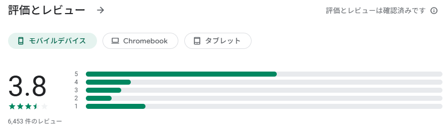 GooglePlayでの評価は下記のとうり3.8ポイントとなっております。